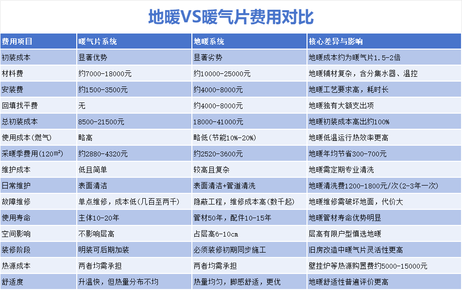 初裝成本結論:在120平米的住宅中,暖氣片係統的初裝成本顯著低於地暖係統,通常隻有地暖的50%-60%甚至更低。地暖高昂的投入主要源於更複雜的材料構成、精細的安裝工藝以及必不可少的回填找平工程。